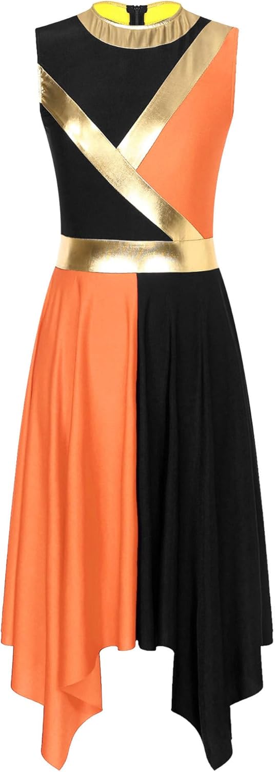 Women Praise Dance Dress Color Block Sleeveless Asymmetrical Hem Leotard Lyrical Contemporary Dress Dancewear
